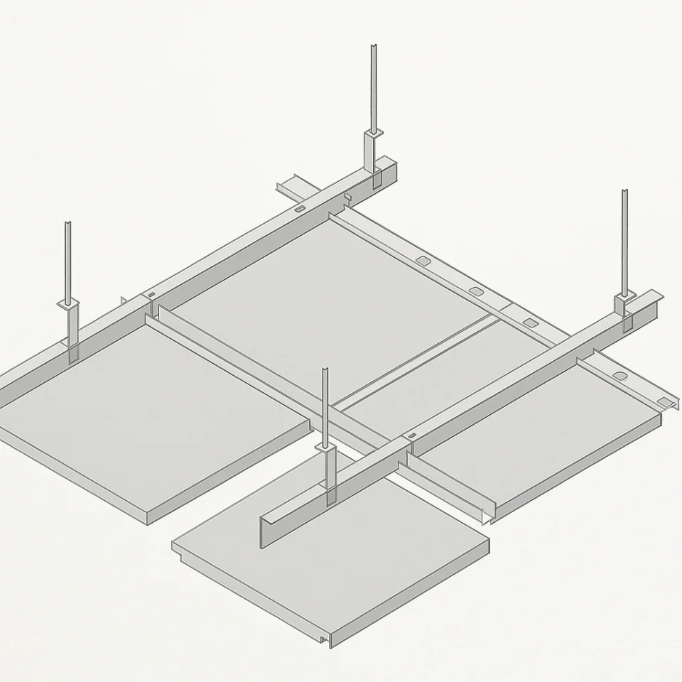 Подвесной потолок Hook-on — это скрытая система крепления, где металлические потолочные панели устанавливаются на специальную несущую конструкцию с помощью «крюкообразного» механизма. Панели надеваются на несущие профили снизу вверх, скрывая несущие элементы от глаз. Такая система часто используется в проектах, требующих стильного, ровного и бесшовного архитектурного потолка.